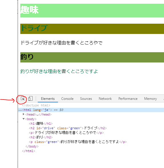 いま、<h2>の項目が2つあって(ドライブと釣り)、その両方の背景がcssで色がついている。