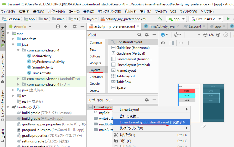 リニアレイアウトでつくっておいて、できあがったら最後に変換するのがよろしい。