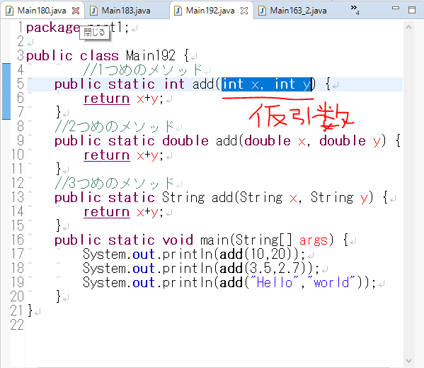 同じ名前のメソッドが複数あってもJAVAさんの方で呼び出し元の引数を見て、「あ、10と20を足したいんだな。じゃあintを足す方の関数addのつもりだろう」とか、「ストリング型を足したいのか、じゃあStringを足す関数addのつもりなんだろう」と考えて実行してくれるらしい。