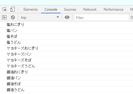 この2つの組み合わせを全部コンソールに出力。↓