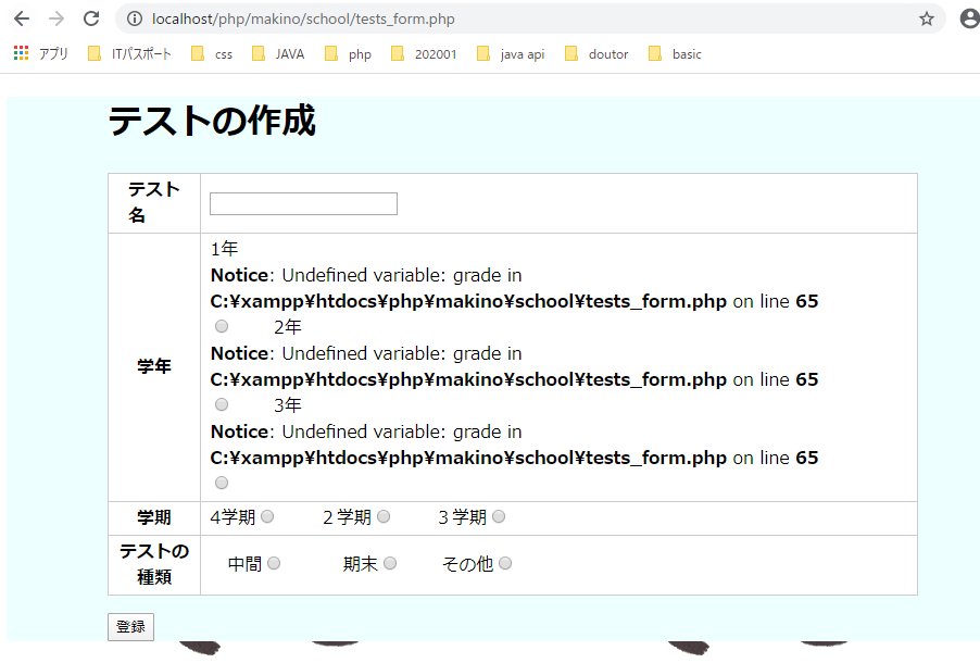 <th>ID</th><th>テスト名</th><th>学年</th><th>学期</th><th>タイプ</th><th>編集</th>