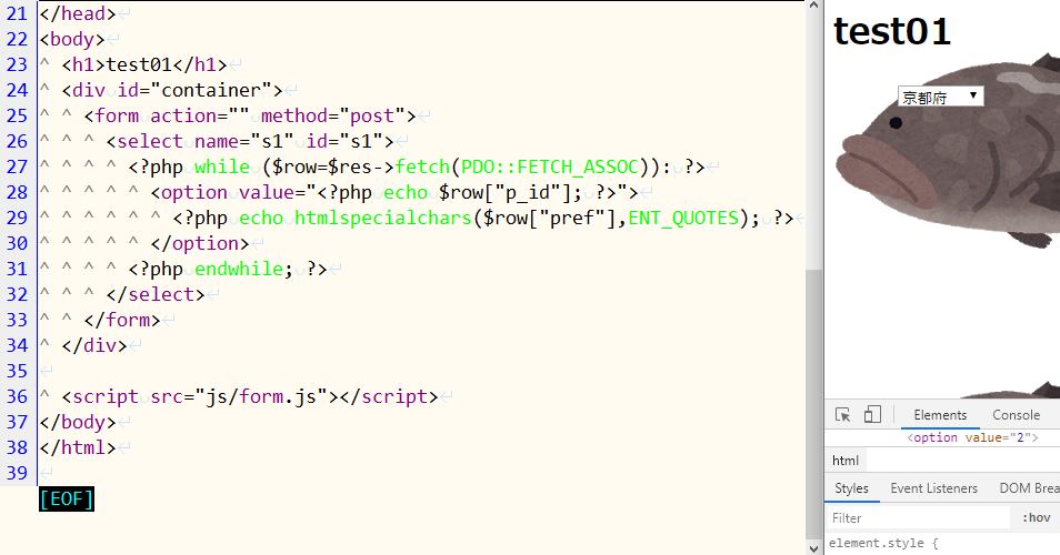 じゃあ非同期通信で、大阪府を選択するとそこの名物を出力したい