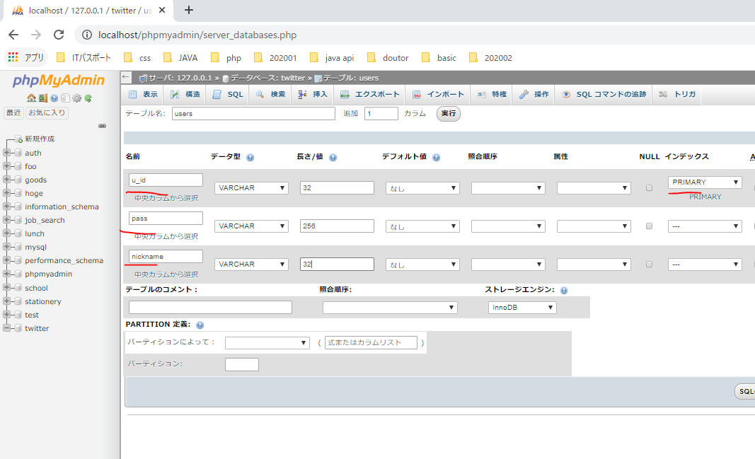 passはハッシュ値をいれる必要ありなのでとりあえず未入力で。