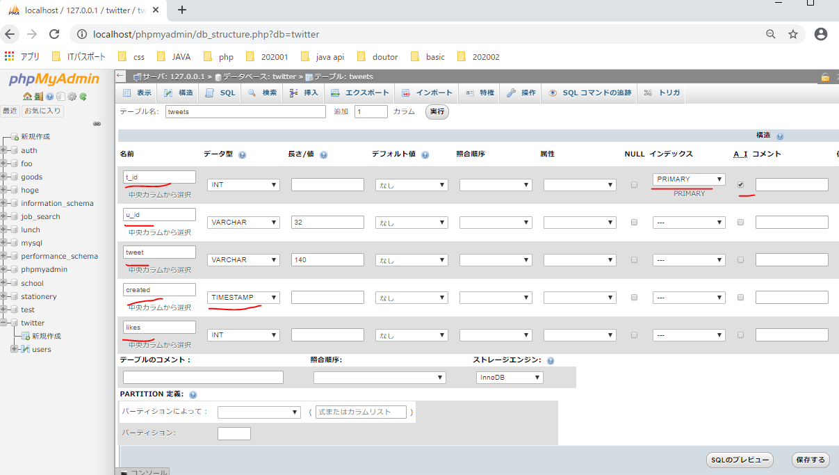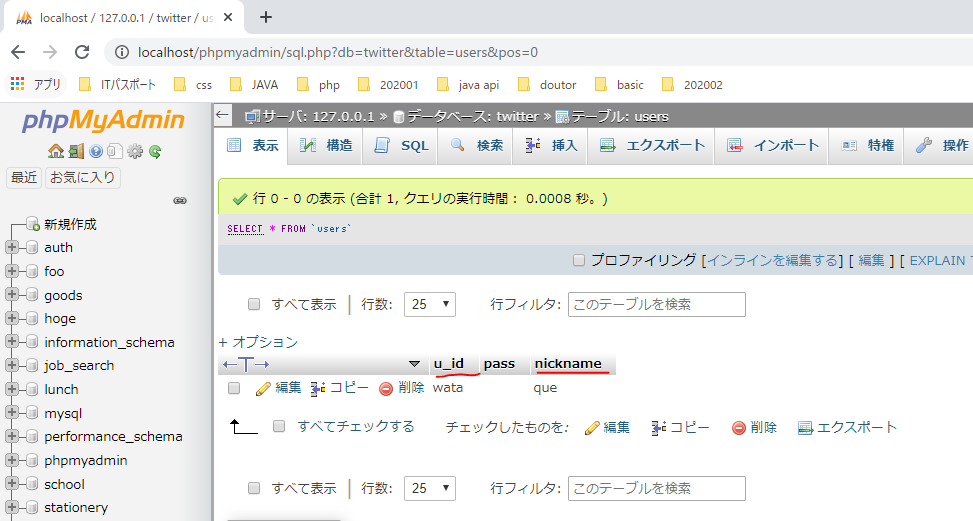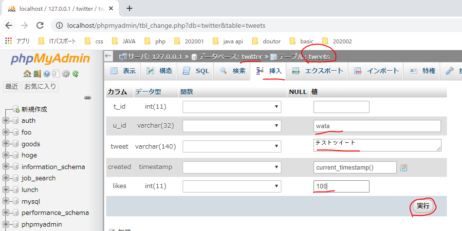 tweetsテーブルにもダミーデータを1つ入れますよ