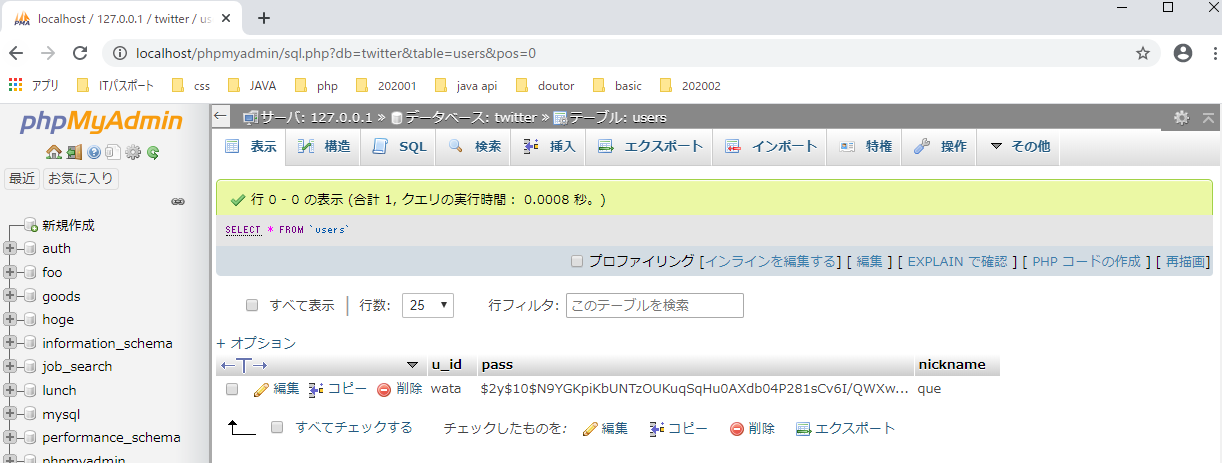 出力し、DB(users/pass)にこのハッシュされたパスワードを追加