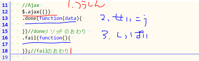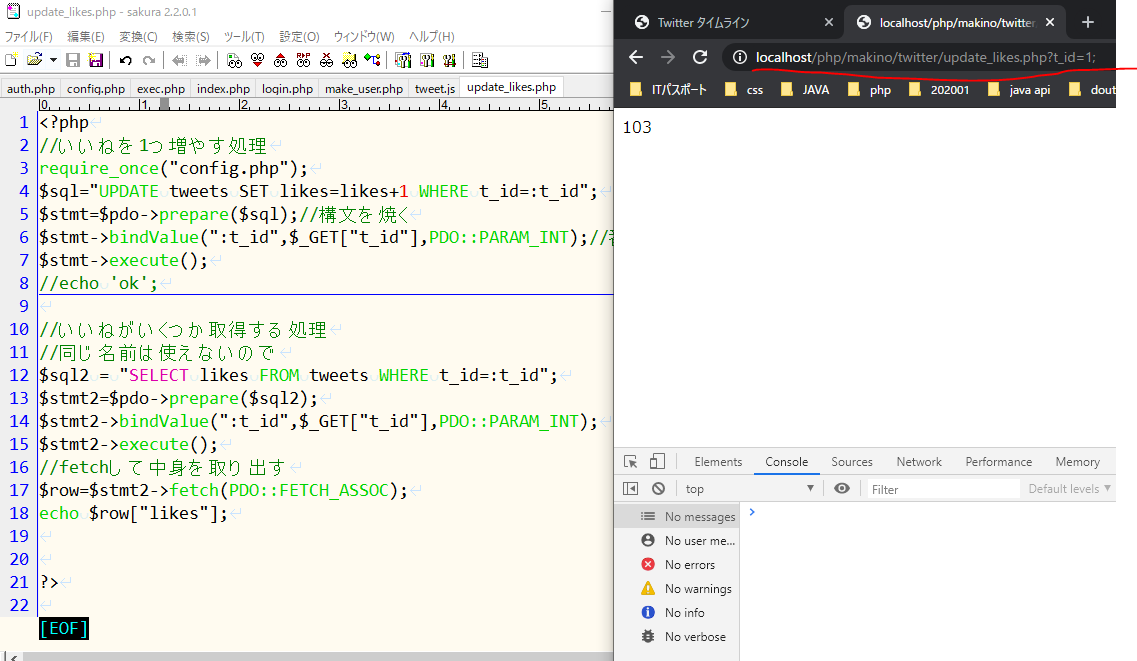 しかしこのままだとなにもないらしくてfailのほうにいくらしく、update_likes.phpのほうにecho 'ok';をいれておくよ