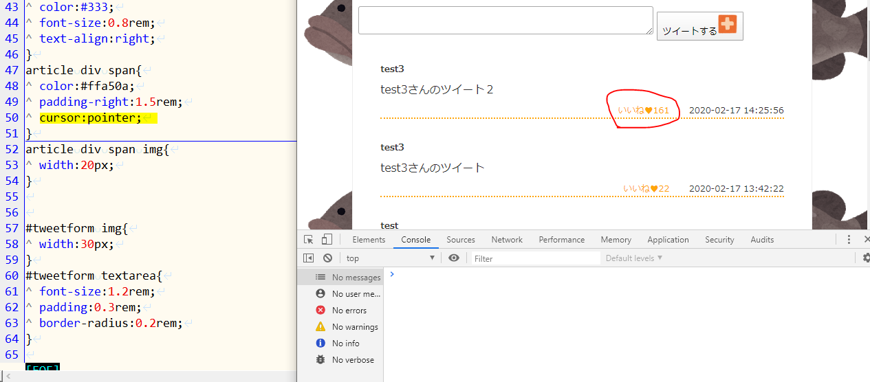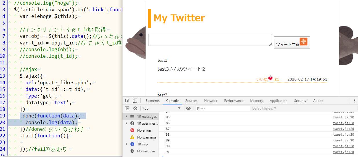 いいねを押してみるとひとつずつconsoleで増えている