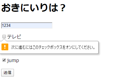 <label><input type="checkbox" name="favorite[]" value="tv" required>テレビ</label>