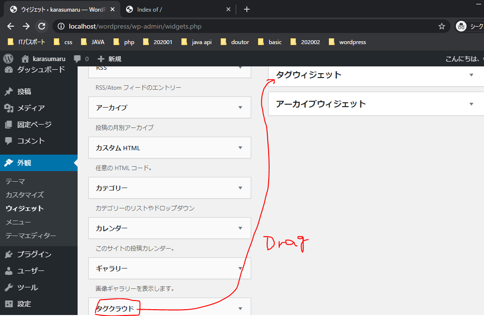 さっぱりわからないが、タグ用のウィジェットは生成された後左側のタグクラウドからタグウィジェットにドラッグして設定する必要あり?かも