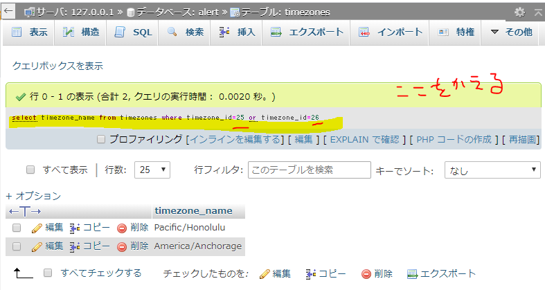 逆にwhileの中でselectして「タイムゾーンの名前をください」というのを書いて配列ではかせる
